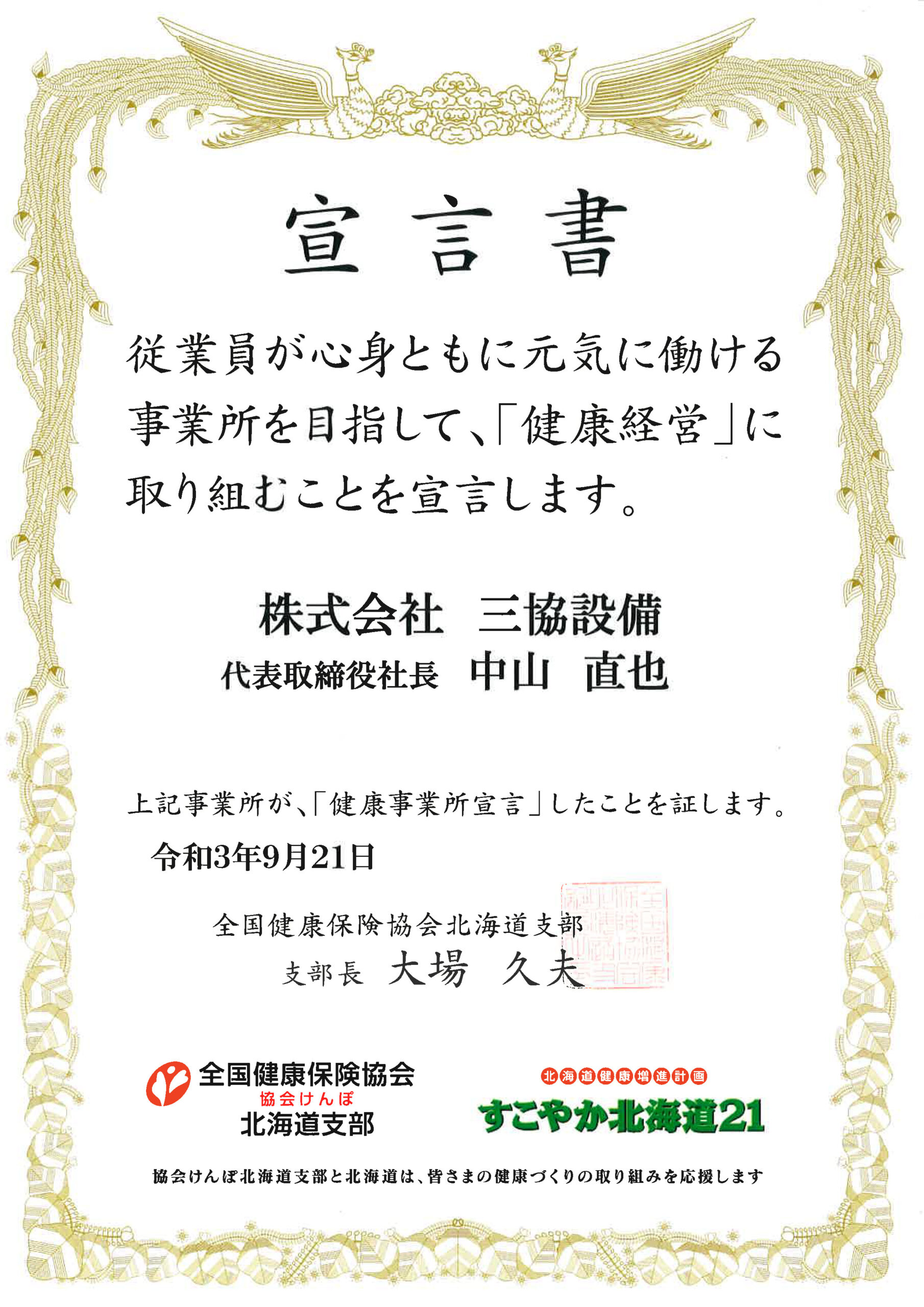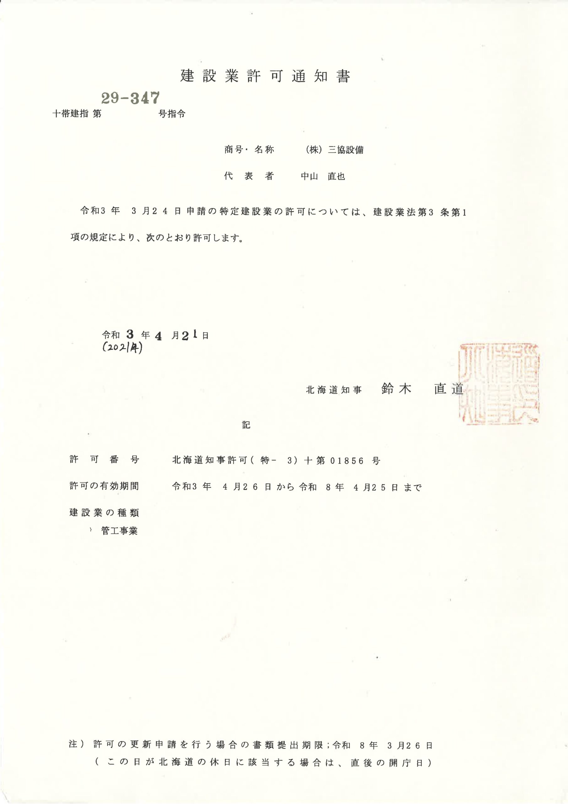 | 建設業許可 | 北海道知事許可(特-3) 十 第01856号 管工事業